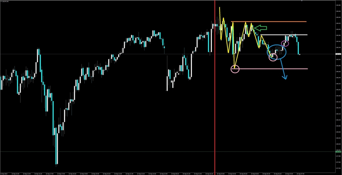 1問目の紫丸以降はトレードすべきではないという判断ができていれば、黄縦線以降にトレードして売っても買っても伸びずイライラするなんてことはなくなるでしょう。