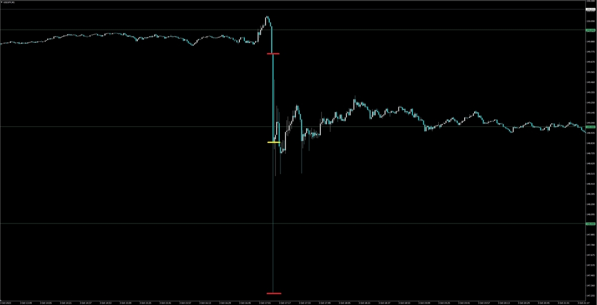 そして、2本のオレンジ線のたった1分間で約85pipsも急落しました。
